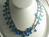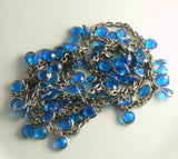 Vintage 48" Blue Glass Bezel Set Dangle Necklace on Gold tone Chain. Each prong set blue faceted glass stone dangles from a gold tone chain. The length is 48", and there's a spring closure, so it can be worn in a number of ways, including tripled as a choker. The width including the dangles is 1/2".