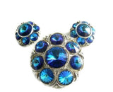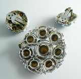 Blue Green Margarita Rivoli Glass Rhinestone Demi Parure set in silver tone metal. Measures 1 5/8" in diameter and over 3/8" tall. The clip earrings are 7/8" wide. Very good condition with some verdigris on the back. circa 1950's.