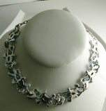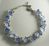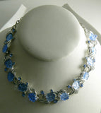 Blue Molded Glass Leaves and Rhinestone Necklace. Set in silver tone metal. Signed Art. Shepherds hook clasp. Measures 15" in length. All original stones, excellent condition. Beautiful necklace.