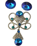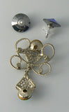 Silver filigree vines and blue rivoli rhinestones set in silver tone metal. C clasp closure. Earrings are for pierced ears. Measures Brooch 1 1/2" wide and 2 3/8" in length. Excellent vintage condition. circa 1950's.