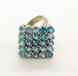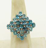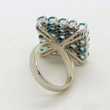 Blue Zircon 52.09 ct. 14k white gold over 925 Sterling Silver Cluster Ring. The stones are oval shaped and measure 4 x 3 mm. The face of the ring measures 21 mm. Size 7.5 Excellent condition.