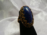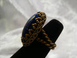 This is a rare type of glass known as Bohemian cobalt aventurine. This type of glass was made solely in the Bohemian region and although the ring is not signed, it was most certainly made in West Germany in the 1950s. This Bohemian glass was produced to imitate Lapis Lazuli and was most often used in Egyptian Revival jewelry. The brass twisted wire ring bands are adjustable so the ring will fit any size finger like your middle or index finger. The smallest the ring can be is a size 7 1/8. The ring is set in a pale gold metal bezel with lovely crown style prongs. The cab also has beveled cuts around the perimeter.