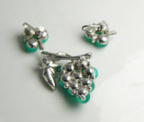 Bright Green Lucite Grape Clusters and Rhinestone Demi Parure. Set in silver tone metal. Measures 2" by 1 1/2" and the screw type earrings are 1/2" Very good condition. circa 1950's.
