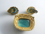 Vintage Austrian Glass Cabochons Brilliant Rhinestones Brooch and Earrings Set. Large Blue Glass cabochons and brilliant prong set blue rhinestones set in gold tone metal. All pieces signed Austria. The brooch Measures 2 2/8" long and 2 1/8" wide, The matching earrings are 1 1/8" long and 1" wide. Excellent condition, high end well made set. circa 1950's.