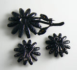 Capri Japanned Black Metal & Rhinestone Flowers Pin Earring Set