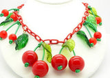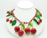 Red Cherries Bakelite, Glass Leaves, Celluloid Chain Necklace. The cherries are Bakelite and simichrome tested. The leaves are glass and it has 2 different shades. Measures 17" (43.18cm) in length. The original clasp has been replaced with a secure lobster clasp. Very good vintage condition. circa 1940's.