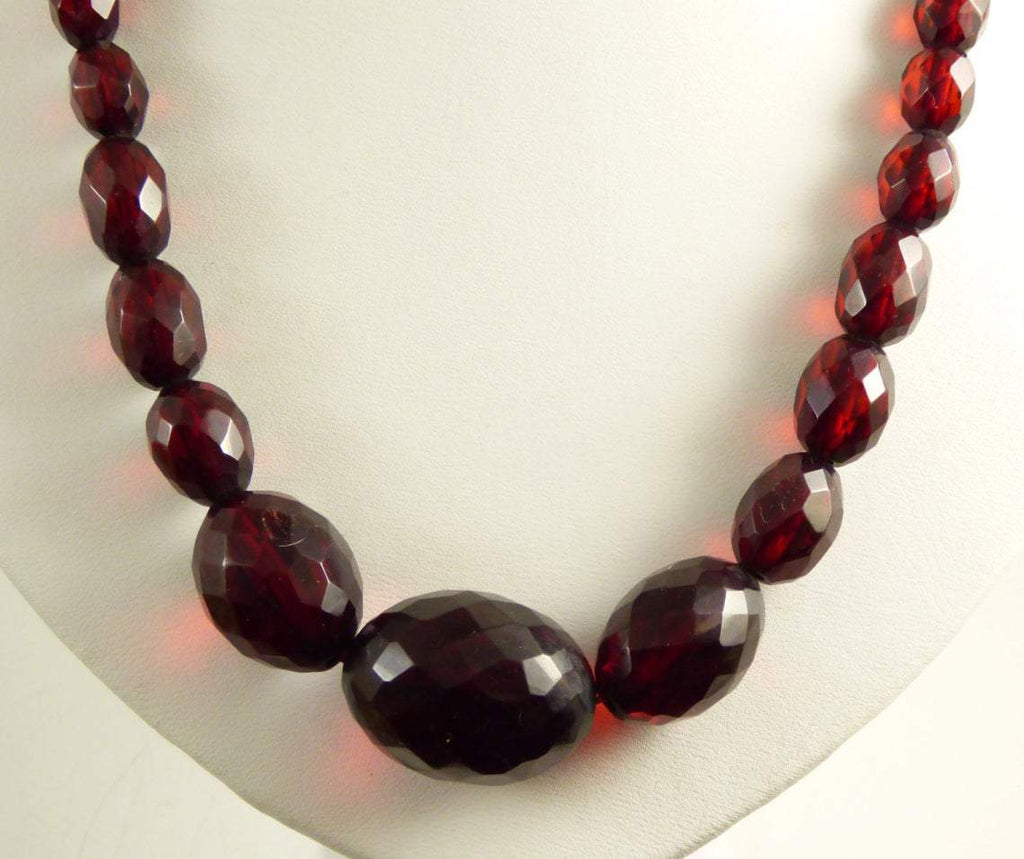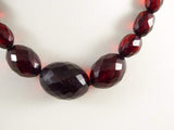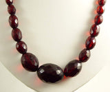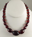 Cherry Bakelite Graduated Bead Necklace, Art Deco. This has large faceted olive shaped Bakelite beads. Measures 19" in length with a secure spring ring clasp. The largest center bead measures 28mm by 21mm. The smallest beads are 11mm by 8mm. 35 total beads weighing 44kg. Very good vintage condition. Simichrome tested. circa 1940's.