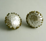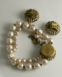 Classic Miriam Haskell Baroque Pearl Cabochon Bracelet & Earring Set. It features 2 strands of baroque pearls on the bracelet with a baroque pearl cabochon decorated clasp. The total length is 7 1/2" and the clasp is 3/4" in diameter. The clip on earrings are an exact match to the clasp and are just a hair larger. The metals have a fair amount of patina and the pearls have high luster. Excellent vintage condition. circa 1950's.
