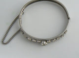 Clear rhinestone bangle designed in heavy silver tone with a chain safety guard and the metal and the rhinestones are in very good condition. The bracelet has a push clasp closure that is tight and works well. It measures 2 1/4" across.