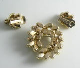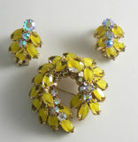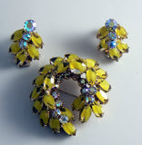 CONTINENTAL Yellow Givre Rhinestone Vintage Brooch Earring Set. This beautiful vintage brooch and clip earring set are gold tone with Aurora Borealis and yellow givre rhinestones. The pin is 1 3/4". All pieces are signed Continental. Excellent condition.