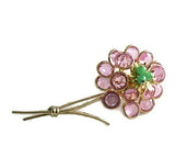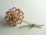 Corocraft bezel set pink crystal flower pin. Signed Corocraft gold tone flower pin. The flower has bezel set pink crystal petals and jade green glass beads in the center. The pin measures 2 7/8" x 1 3/8". Condition is good. circa 1960's.