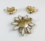 Crown Trifari Poured White Glass Flower Demi Parure, Milk Glass, Clip Earrings. Set in gold tone metal. Signed Crown Trifari, Classic Milk Glass lower with matching petal clip earrings. Measures 2 1/4" in diameter. Good condition. circa 1950's.
