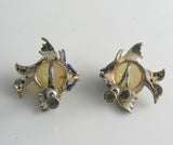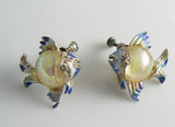 Cute Coro Lucite Enamel Rhinestone Fish Earrings set in silver tone metal. Signed Coro. Lucite Bodies and screw type backs. Measure 1 1 /4" Backs are secure but they do have wear to the metal.