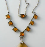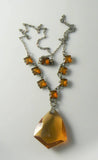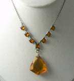 Art Deco dark citrine or light amber colored glass pendant necklace which features a shield shaped pendant, accented by square open-backed prong-set rhinestones, suspended by a silver tone chain. It closes with a square, rhinestone-topped push-in clasp which is in good working order. Measures 16 1/2" The pendant from top of bail to bottom of pendant is 1.375" There are a few tiny flea bites to the edges here and there on the pendant as to be expected with a glass pendant that is around 80-90 years old. Overall very good condition.