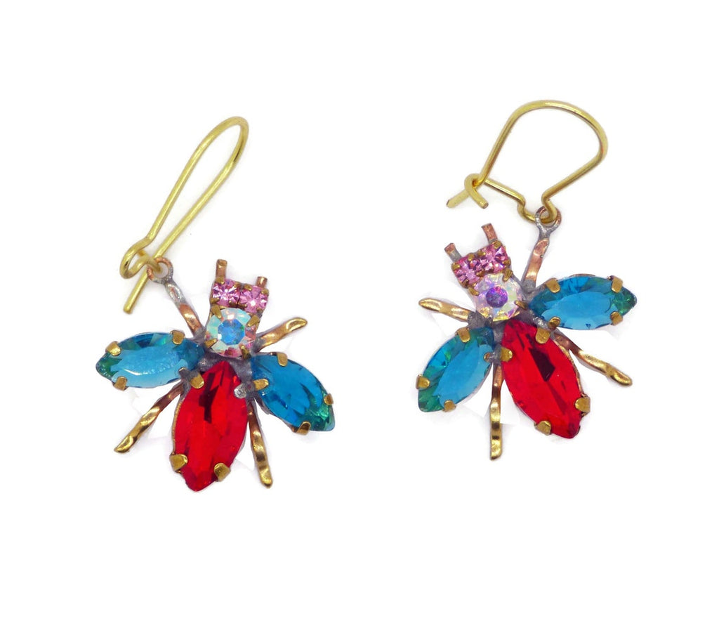 Czech Glass Aqua and Red Fly Earrings. Aqua blue wings and red glass body. Set in non plated brass. Pierced style. Measure a little under 1/2" Very good condition.