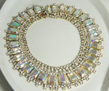 Czech Glass Borealis Rhinestone Bib Necklace. Set in non-plated brass. Signed Husar D. Large emerald cut AB glass stones. The stones have a 3D effect. Surrounded by rows and rows of round borealis faceted stones. Measures 17" with the" extension chain, shepherds hook clasp. 1 3/4" wide. Very good condition.