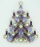 Christmas Tree Candles Shades of Lavender Brooch, Vintage Rhinestones Xmas Tree Pin. Set in non-plated brass. This has purple and lavender glass faceted rhinestones. Purple rhinestones make up the candles on the side of the tree. Measures 3" by 2" Excellent condition.