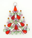 Czech Glass Candles Red, Lavender and light green Christmas Tree Brooch, Vintage Rhinestones Xmas Tree Pin