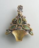 Czech Glass Christmas Flower Tree Pin. Set in non-plated gold tone metal. Red rhinestone centers with clear stone petals set in a light green rhinestone potted tree. Measures 2 3/4" by 1 3/4" Excellent condition.