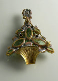 Czech Glass Christmas Flower Tree Pin. Set in non-plated gold tone metal. Dark green rhinestone centers with clear stone petals set in a light green rhinestone potted tree. Measures 2 3/4" by 1 3/4" Excellent condition.