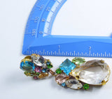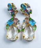 Czech Glass Clear Teardrops with Pastel Rhinestones Clip Earrings. Set in non-plated brass. These have a large clear teardrop shaped glass stones with pastel glass rhinestones. Measures 2 1/2" by 1 1/4" Excellent condition.