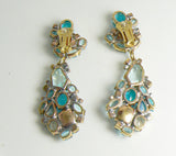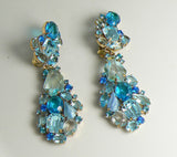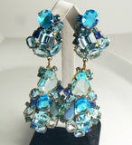 Czech Glass Huge Dangling Clip Earrings. Set in non-plated brass. Open back light blue and robins egg blue glass stones. These are large earrings, measuring 3 1/2" by 1" Excellent condition.