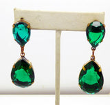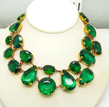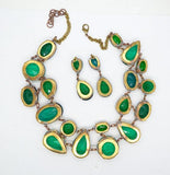 Czech Glass Emerald Green Cluster Statement Necklace and Pierced Earrings Set. Set in non-plated brass. The oval stones measure 30 mm by 20mm. The necklace measures 17" in length with a 1 3/4" extension chain. Secure lobster claw clasp. The earrings measures 2" by 1/2" Excellent vintage condition.