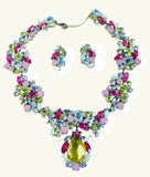 Czech Glass Pastel Rhinestone Pendant Necklace and Clip Earrings. Set in non-plated brass. Measures 18' in length. The drop pendant measures1 1/2" by 1 1/4" Excellent condition.