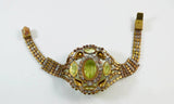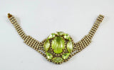 Czech Vaseline Uranium Glass Bracelet. Set in non-plated brass. All stones are uranium glass and will glow under UV light. Measures 7 1/4" not including clasp. The face measures 2 1/4" Very good vintage condition.