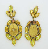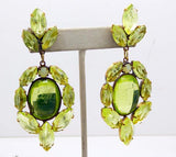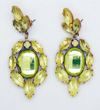 Czech Vaseline Uranium Glass Pierced Earrings. Unsigned Husar D. Set in non-plated brass. All stones are uranium glass and will glow under UV light. Measures 3 1/2" by 1 1/4" Very good vintage condition.