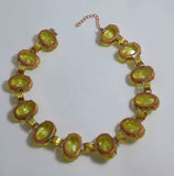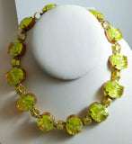 Czech Glass Vaseline Uranium Statement Necklace set in non-plated brass with gold tone links. The oval stones measure 24mm by 18mm. All stones will glow under UV light. Unsigned Husar D. Measures 16" including the 3" extender with a lobster claw clasp. Excellent condition.