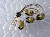 Brooch and pendant set made by the DeLizza and Elster company for Sarah Coventry in 1965. Peridot green open backed rhinestones are capped by gold toned filigree caps. Book Piece - "The Art of Juliana Jewelry" by Katerina Musetti, page 212. Excellent condition.