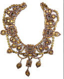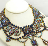 Dark Indigo Czech Glass Rhinestones and Baby Blue Cabochons Necklace. Set in non-plated brass. Unique Statement Necklace with round dark indigo faceted glass stones and baby blue glass cabochons. It also has emerald cut watermelon heliotrope stones and round rainbow rhinestones. Measures 15" in length with a 2" extension chain. Very good vintage condition.