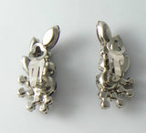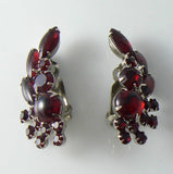 These have spectacular vibrant red rhinestones and translucent art glass navettes. They are confirmed Delizza & Elster and have all the characteristics; the clip has a scalloped edge with three punched holes, there is puddling of solder and all rhinestones are prong set. The reverse is silver tone with a closed back. They measure 1 7/8" long and 7/8" wide and are in excellent condition.