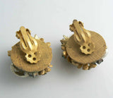 Early Miriam Haskell Gold Chain & Baroque Pearl Necklace Earring Set. It features 7 different textured gold chains on the necklace, one of which has tiny seed pearls intertwined through it. There is also 1 strand of baroque and round glass pearls and a gorgeous clasp that's decorated with a baroque pearl cabochon surrounded and partially covered with gold leaves and flowers, rhinestones, turquoise stones and smaller pearls. The total length is 24" at the shortest strand and the clasp is 1.5" x 1.5". The clip-on earrings are an exact match to the clasp and measure a hair over 1" in diameter. All of the pearls have high luster with no peeling, all wiring is tight and nothing is missing with the exception of one earring has a chipped pearl as seen in the last picture. There a a couple tiny fleabites on the larger baroque pearls. A beautiful set.