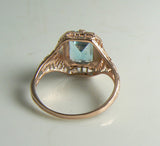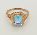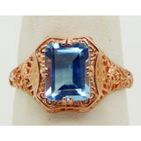 Edwardian revival filigree ring in rose gold over solid sterling silver. Marked 925. The emerald cut high quality natural genuine sky blue topaz gemstone is 9mm by 7mm, (approximately 2.75ct). Size 7. Excellent condition.