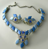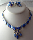 Vintage necklace and earring set that is unsigned. It is done in different shades of blue thermoset stones and blue rhinestones. Finished in a silver tone metal that necklace is 19" long and the matching clip earrings are 1 1/4" and the set is in good condition.