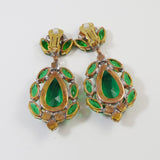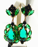Emerald Green Czech Glass Huge Dangling Clip Earrings. Set in non-plated brass. Open back bright aqua blue glass stones. These are huge stunning earrings, measuring 3 1/4" by 1 1/2" Excellent condition.