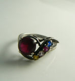 Estate Art Deco Sterling Silver Ruby and Yellow Sapphire Ring. The center ruby gemstone is round cut, prong set, and lined with gorgeous gemstones - yellow sapphire, pink topaz, red sapphire, and blue sapphire. The setting is as stunning as the stones, and each one tests as genuine stones on our Presidium gem tester. Marked Sterling. Measures Approx: just over 3/8" top to bottom of ring x just over 5/8" wide Center stone, 7mm in diameter. Size 8.