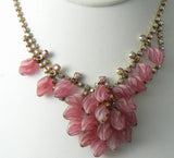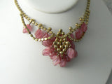 Fantastic D&E Juliana drippy bib necklace. The necklace is adorned with many swirled Art glass Pink beads. These are all free moving and give the necklace an amazing flare! The chain is studded with beautiful faceted grapefruit aurora borealis glass rhinestones. It is done in a lovely gold tone metal . Measurements: Length: 16 1/4", and Width (widest) 2"
