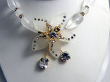 Femmina Frosted Lucite Sparkling Ice Rhinestone Necklace Clip Earring Set. Set in gold tone metal. This has clear Lucite beads with rhinestone rondelles. The center has Lucite petals. Measures 15" in length and the clip earrings re 1 1/2" in diameter. Very good condition.