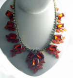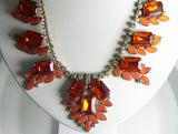Orange emerald cut stones, opaque orange marquises with clear cut faceted rhinestones.Set in non-plated brass. Signed Taboo. Measures 18 1/2" in length including extension chain. Very good condition.