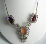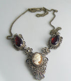 Filigree Shell Cameo Necklace With Ruby Glass Stones. Large ruby red glass tones and a carved shell cameo adorn this antique filigree necklace. The chain looks like a gold vermeil over brass with some of the vermeil worn off which only accents the antique look. Measures 18" in length. The cameo measures 18mm by 14 mm. Very good condition.