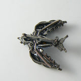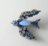 The bird has two shades of blue rhinestones-light blue and teal, the body has a marquise cabochon in blue moonstone glass. The wings are attached with tight springs and 'tremble' with movement. The pin measures 1.5" square. It is signed Florenza under the pin stem. Excellent condition, no damage or visible wear, secure safety clasp. circa 1960's.