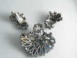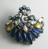Florenza Blue, Satin and Sparkling AB Demi Parure. Satin blue navettes frame the back row, while AB round and navettes make up the center cluster. Set in a pot metal finish and signed Florenza. Measures 2" by 2. 1/4. There is some wear to the navettes on the back row, particularly the foil backing has been worn. Overall this does not detract from it's beauty.