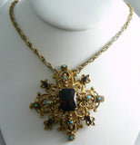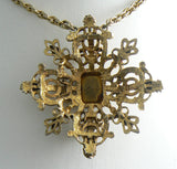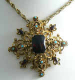 Florenza Rose Cut Garnet Turquoise Glass Maltese Cross Pendant Necklace. The cross is gilded brass and the chain is gold tone. The stones are all glass. Signed Florenza. Measures 2 1/2" in diameter. The chain measures 19 1/2" in length. Excellent condition.