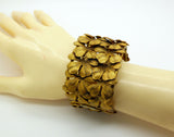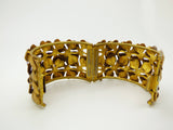 Four Leaf Clover Wide Hinged Bracelet, Brushed Gold Tone. Bracelet consist of a double row of four leaf clovers. It has a heavy wire frame. It is hinged and has a snap closure. Measures approx. 2 1/4” by 2” wide by 1 1/2”tall. It will fit a 6 1/2" wrist with the ends meeting when closed. Excellent Condition.