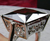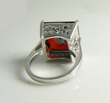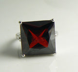 Garnet Zirconia 12 ct Sterling Silver Filigree Ring, Size 6.5. Stamped 925. The square-cut scarlet red garnet CZ is 15mm (about 9/16th of an inch) in length and 15mm in wide. Excellent condition. circa 1980's.