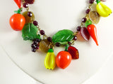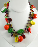 Glass Fruit and Red Peppers Necklace. This has large glass leaves, apples, grapes, red peppers and bananas. Secure lobster claw clasp. Measures 24" in length. The apples are 21mm by 18mm. Excellent condition. circa 1960's.