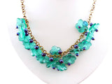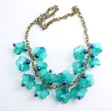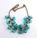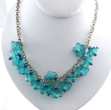Glass Teal Colored Flowers with Dark Blue Beaded Brass Necklace